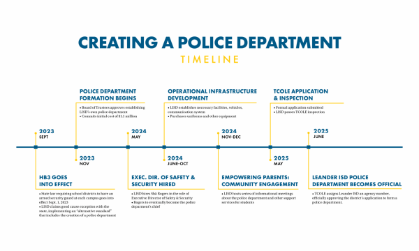 According to Little, the goal of the LISD police force is to shift away from the four police departments serving the district — Travis County PD, Cedar Park PD, Leander PD, Austin PD — to one department to increase consistency, communication, and efficiency across schools.